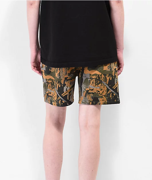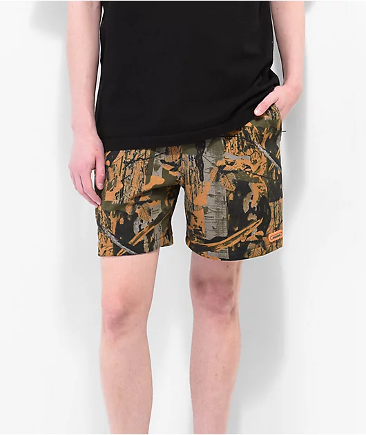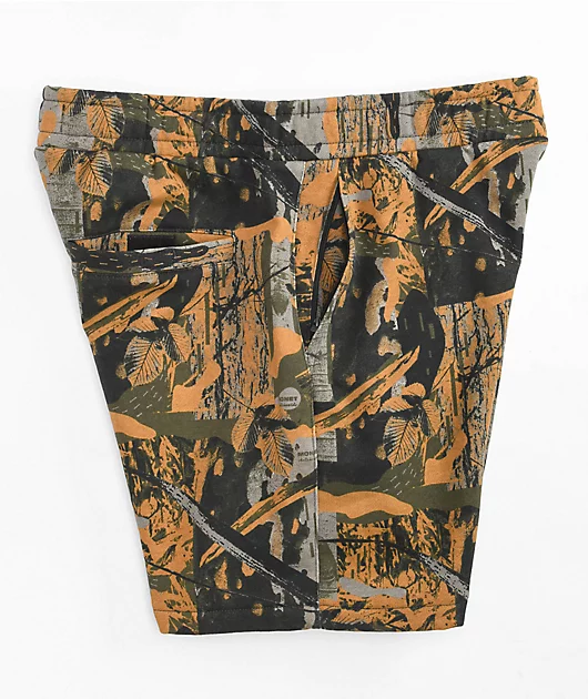 From Monet Skateboards, the Tricky sweat shorts feature a hunter camo motif sublimated throughout, with an orange rubber brand patch near the left leg opening. With a simple 3-pocket design, and an elastic drawstring waist, the casual shorts are fini