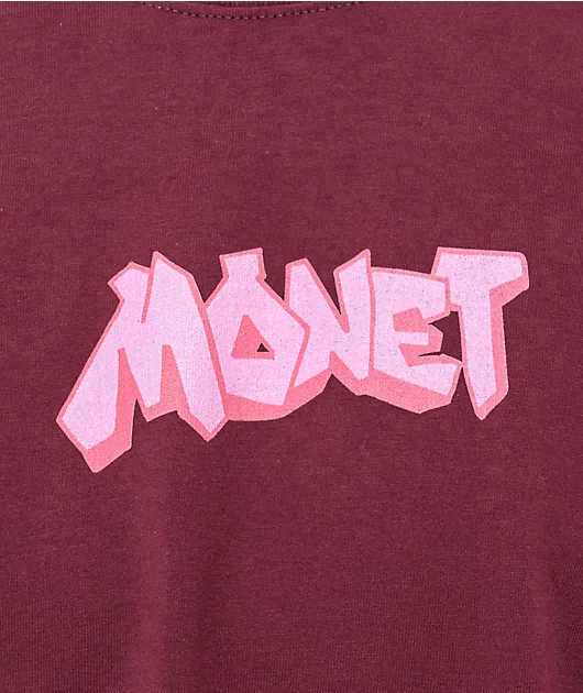 the wild style t-shirt from monet is made of 100% cotton and comes in a maroon colorway with pink brand script across the chest.