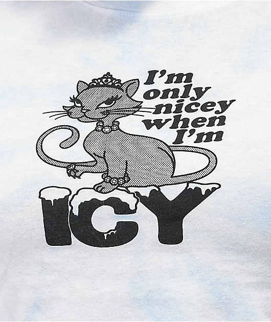 Freshen up your wardrobe in a cool, new way with the Icy blue tie dye crop long sleeve t-shirt from NGOrder! This white-and-blue tie dye tee sports a graphic at the chest of a bemused cat surrounded by text reading \”I’m only nice when I’m icy\” to finish o