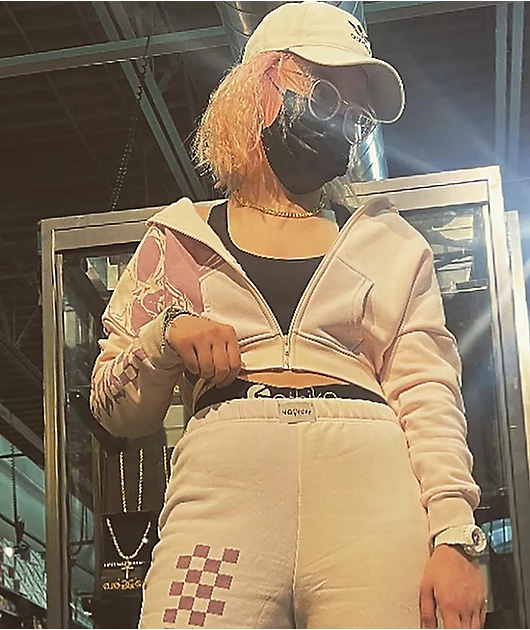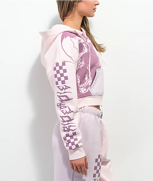 The Ride Or Die crop hoodie from NGOrder has a slim, cropped silhouette that cuts just above the waistline, and is made from a thick, cozy cotton-poly blend. It has a pastel pink colorway and a purple, screen-printed graphic of a skull on the right half o