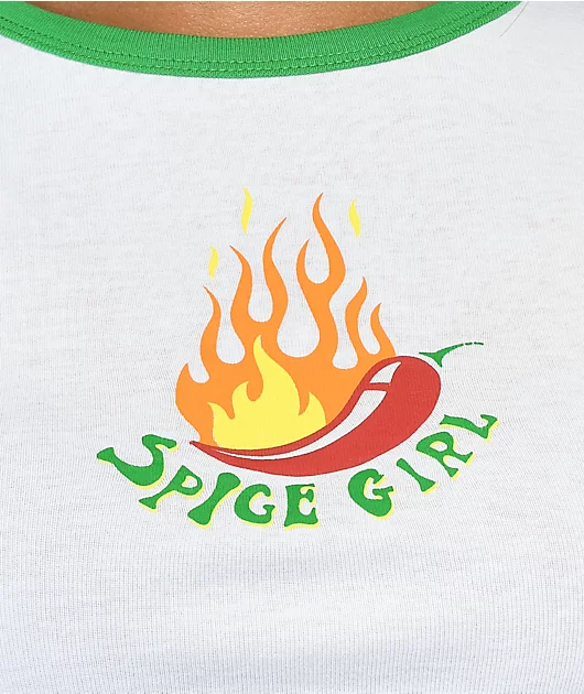 From NGOrder comes the Spice girl ringer t-shirt in a cropped white and green construction. A screen-printed graphic of a flaming chili pepper is situated on the chest, above green \”Spice girl\” text. Fabricated using super soft 100% cotton, the slim, crop