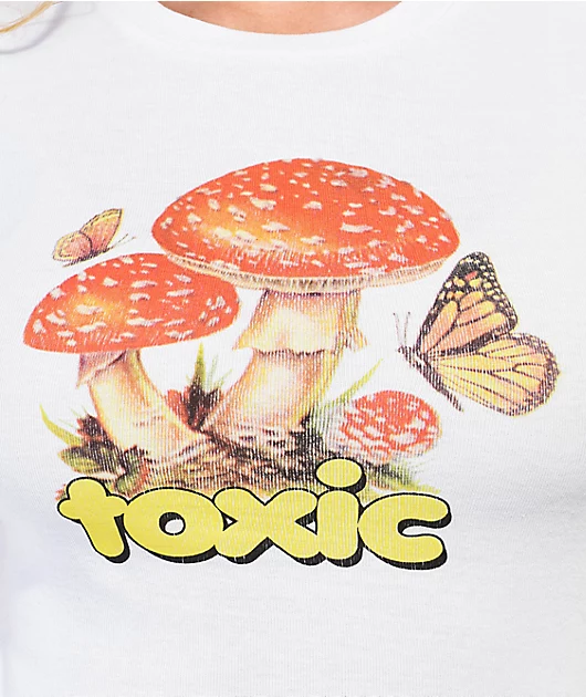 From London-based label NG Order comes the Toxic crop t-shirt in a white colorway. A scene with mushrooms and butterflies is screen-printed across the baby tee, while yellow lettering which reads \”Toxic\” can be seen below. With a tight, cropped constructi