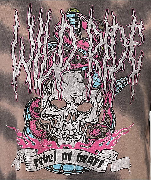 The Wild Ride t-shirt from NGOrder comes in a relaxed, cropped fit with a custom bleach dye treatment throughout. Decorating the front of the shirt is a screen-printed graphic of a skull with flames, NGOrder logo script, and text that reads \”wild ride\” in