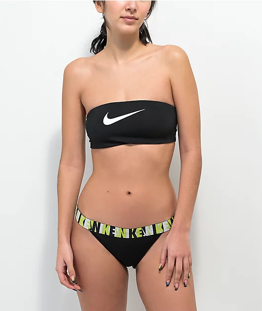 The Banded bandeau from Nike comes in a black colorway with a fitted, strapless silhouette. On the front of the bandeau, a screen-printed white Nike swoosh logo contrasts the black background while the back features two stretchy bands with the brand name