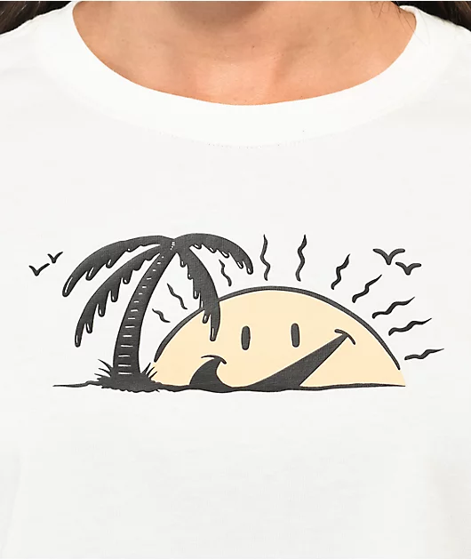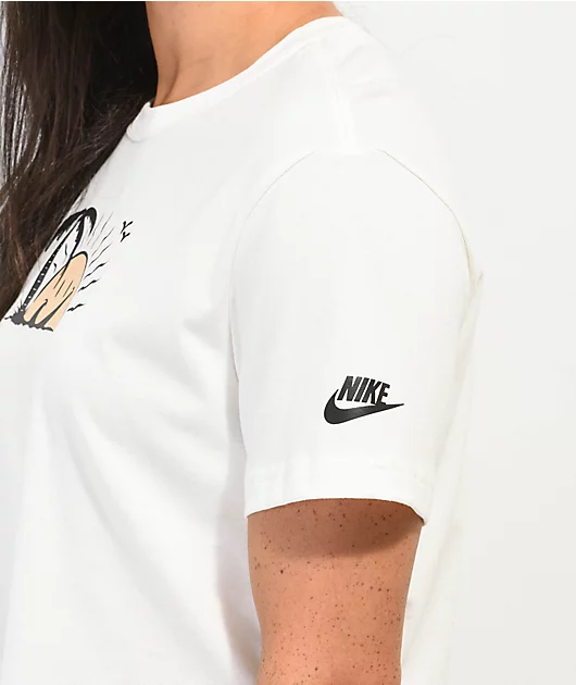 The crop Nike t-shirt comes in a cream colorway with a screen-printed graphic on the front of a personified sun with a Swoosh logo for a mouth setting over a palm tree as well the brand logo on the left sleeve. This shirt is made of 100% cotton comes in a