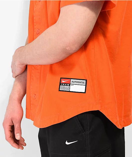 Coming in a team orange colorway, the Nike SB baseball jersey has a relaxed silhouette with piped shoulder seam accents. Nike embroidery appears along the left chest, while a woven tag sits along the bottom hem, which gives off a retro sporty vibe. The re