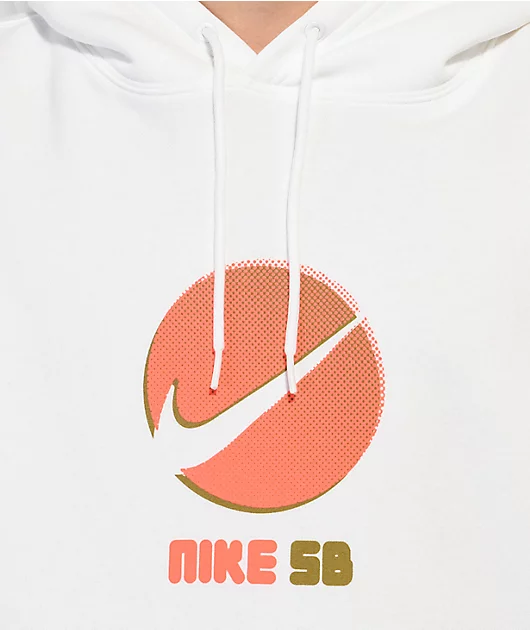 The Sun Spots hoodie from Nike SB comes in a white colorway with a relaxed fit. The chest features retro-inspired Nike branding in bright orange and gold, with a layered pop art look. The Nike skateboarding sweatshirt is made from a soft cotton blend, and