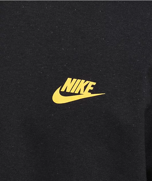 Nike Sportswear introduces the Camo long sleeve t-shirt in a solid black colorway. This soft cotton shirt boasts the Nike Swoosh logo at the left chest, while the same graphic appears at the back with a square camo background.