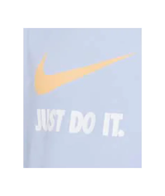 The kids Just Do It Swoosh t-shirt from Nike Sportswear is made of 100% cotton and comes in a light blue colorway, with a gold Swoosh logo and white \”Just Do It\” script screen-printed across the chest for bold branding.