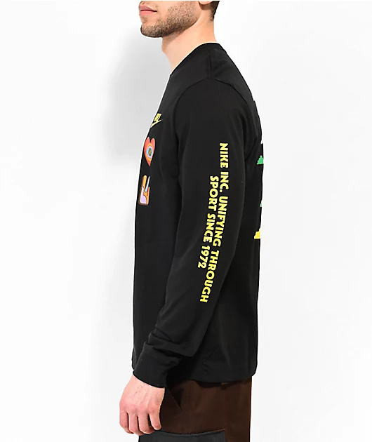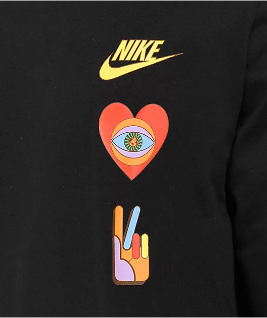 From Nike Sportswear comes the Pack long sleeve t-shirt in a black colorway with a soft, midweight cotton construction. The shirt features a screen-printed Nike logo, heart, and a hand holding up the piece sign at the left chest, a vibrant landscape graph