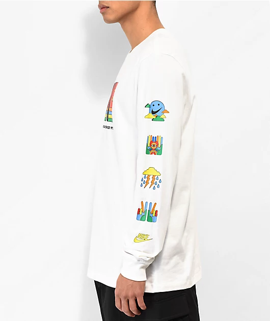 In a crisp white colorway comes the SO Pack long sleeve t-shirt from Nike Sportswear, showing off the brand name across the chest in pops of color of red, orange, blue, yellow, and green. Down the sleeves of this graphic tee are colorful screen-printed gr