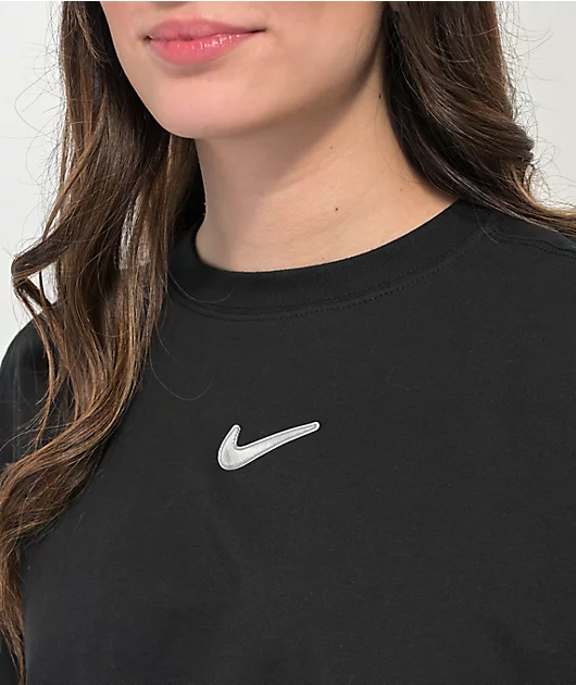 The Swoosh t-shirt from Nike Sportswear comes in a stylish long sleeve, crop construction in a black colorway. This soft, 100% cotton t-shirt is adorned with a plastic Swoosh logo woven onto the front and screen-printed graphics of the logo on the back.