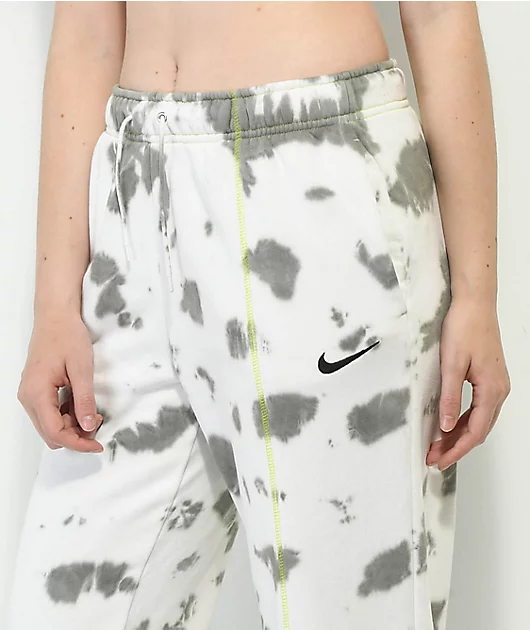 These white sweatpants from Nike Sportswear features grey tie dye throughout, lime green stitching, and the Swoosh logo embroidered onto the left hip for contrasting branding. The soft cotton-poly sweatpants have an elastic waistband with an adjustable dr