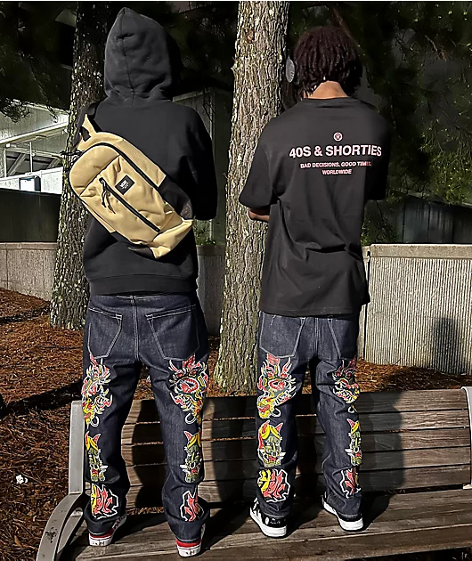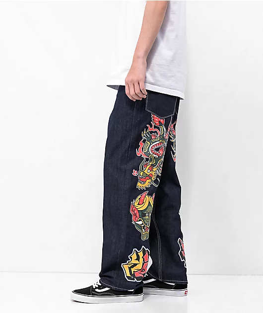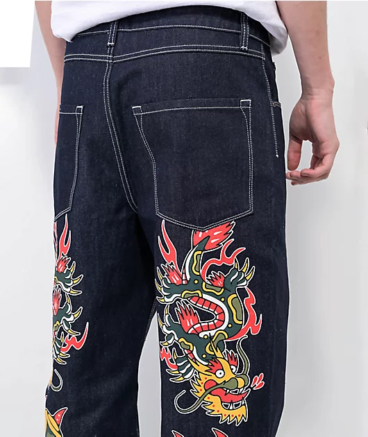 Ninth Hall brings the baggy fit jeans in a raw denim construction, offering storage with a classic 5-pocket configuration. Down the backs of both pant legs are colorful screen-printed images of Japanese-style tattoo artwork in accents of red, green, and y