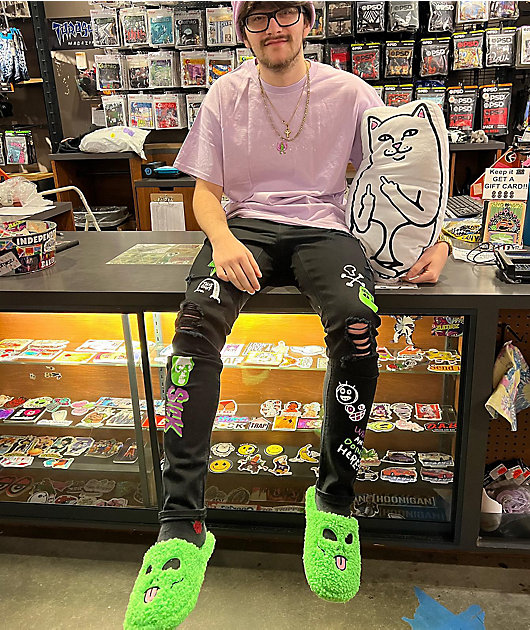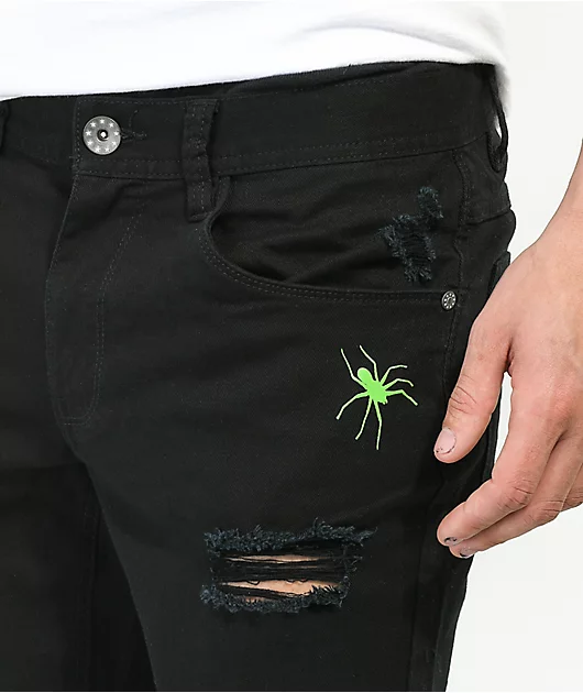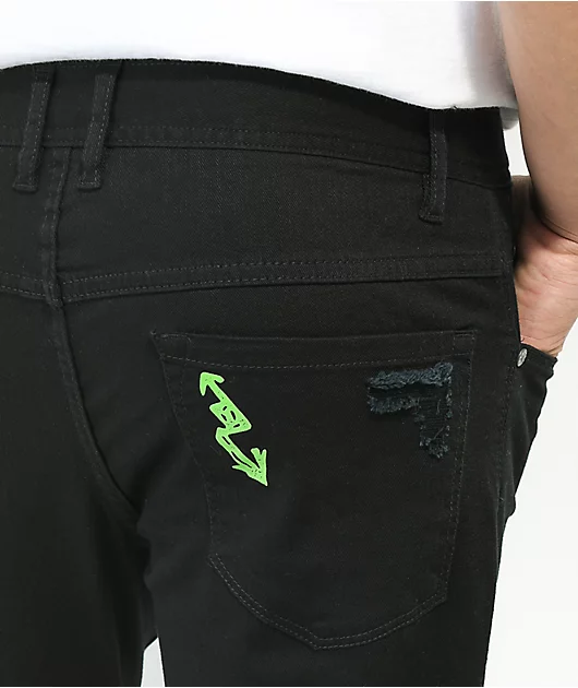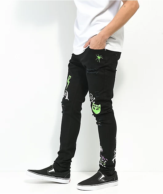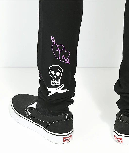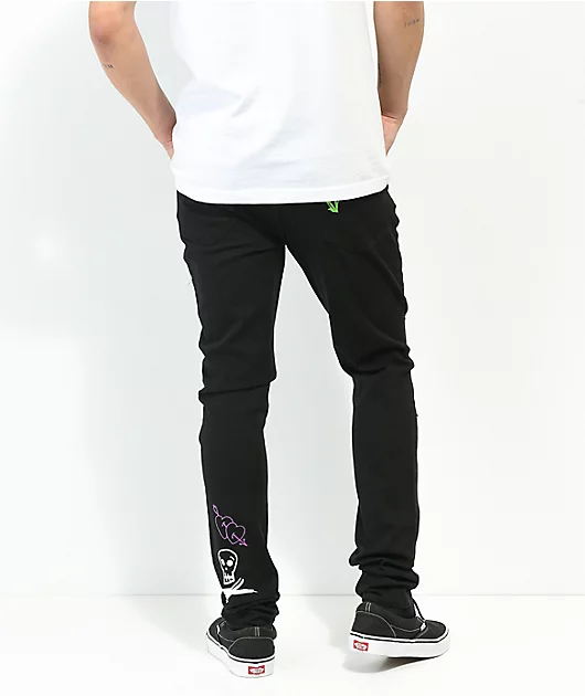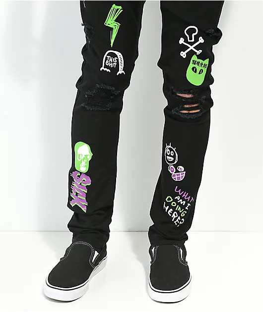 The Rogue Ninth Hall skinny jeans have a tight fit from the thigh to the ankle, and a regular rise. These emo pants are featured in black denim with mild distressing on the legs, as well as several scribble inspired printed graphics throughout. These skin