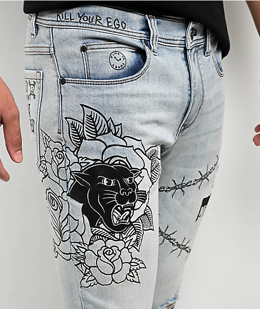 Toss some DIY style into your jeans collection with the Ninth Hall Rogue Printed light aged skinny jeans! These light blue wash jeans feature various graphics printed throughout in a scribbly, marker style for a custom look. A horseshoe and clover, barbed