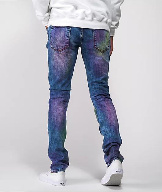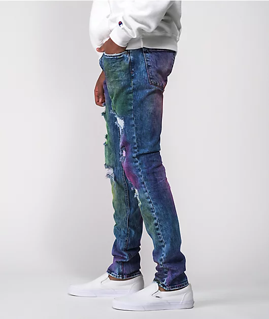 Toss some fresh color into your wardrobe with the Spectrum denim jeans from Ninth Hall! These blue jeans feature a unique pink and green treatment throughout, creating an alluring tri-tone aesthetic. With comfy cotton-spandex construction, these striking