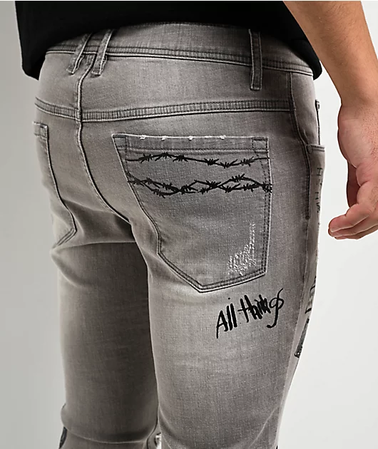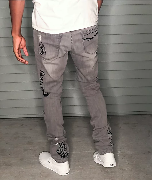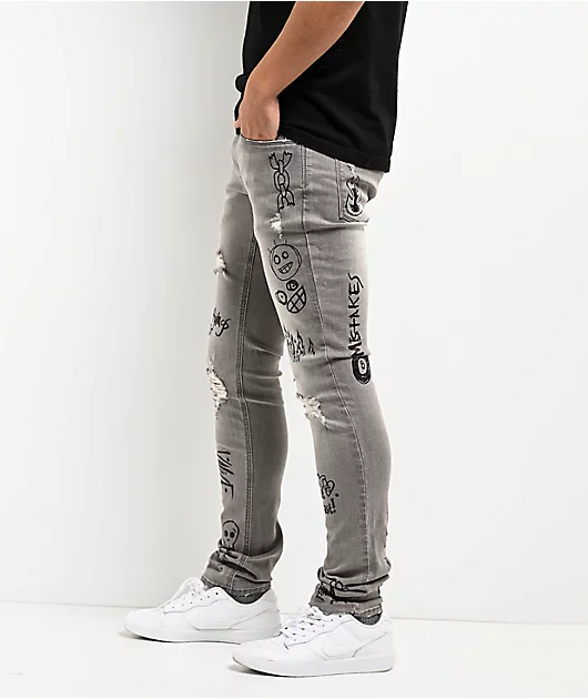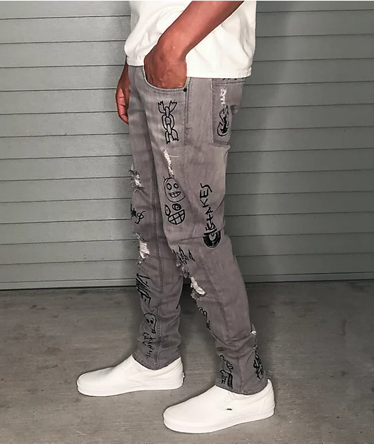 Add some DIY-inspired looks to your daily fits with the Rogue Tapered Printed smoke skinny jeans from Ninth Hall! These grey, distressed jeans feature a ton of permanent marker-style graphics scribbled throughout including a skull, flames, chains, and a g