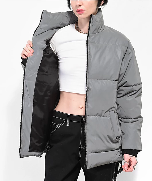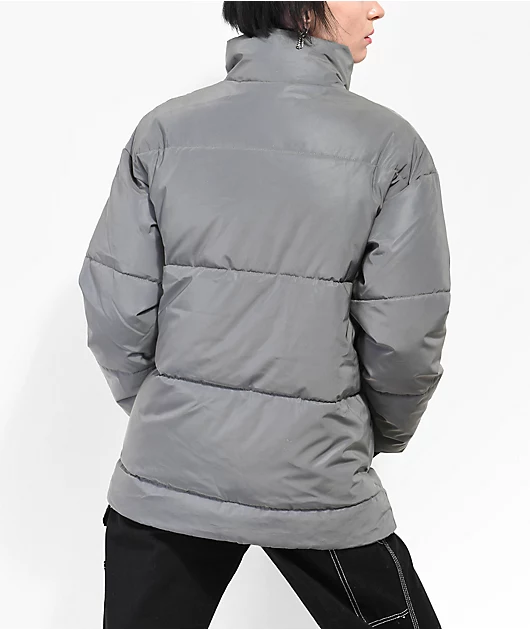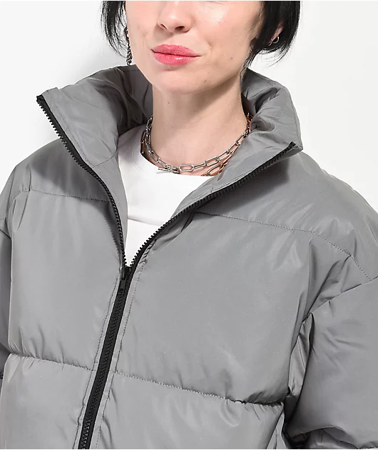 The Shae puffer jacket from Ninth Hall features a reflective silver colorway with full zip closure and a mock neck collar. This puffy jacket has a polyester shell with insulation to keep in heat and dual slash hand pockets to keep your hands snug and warm