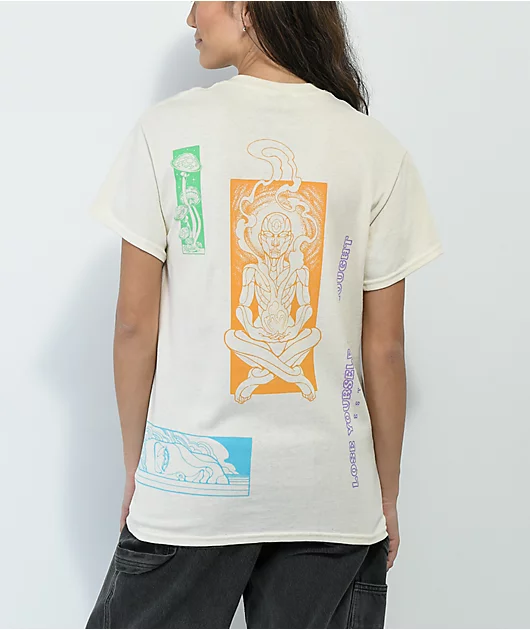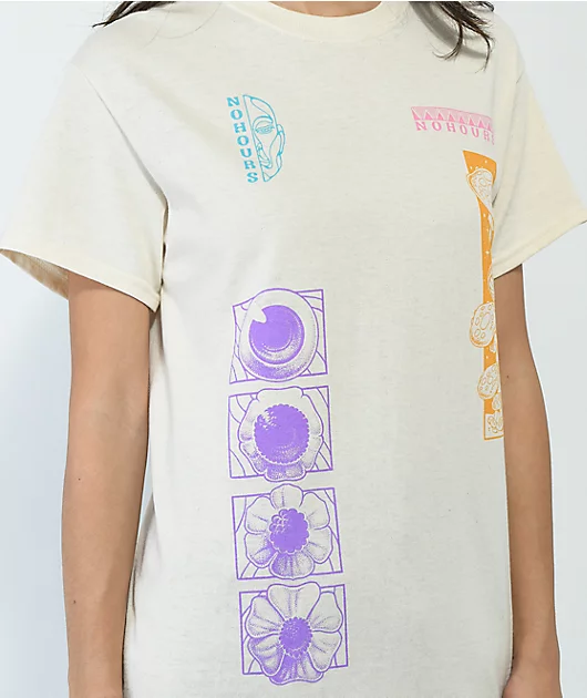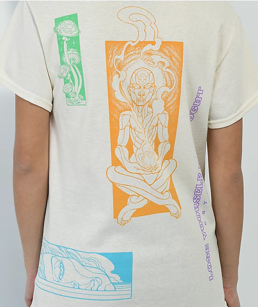 The In Thought NoHours t-shirt comes in a tan colorway with the brand name on the left of chest and screen-printed graphics throughout of various natural forms including a woman’s face and a sprig of mushrooms, as well as script reading, \”Lose yourself in