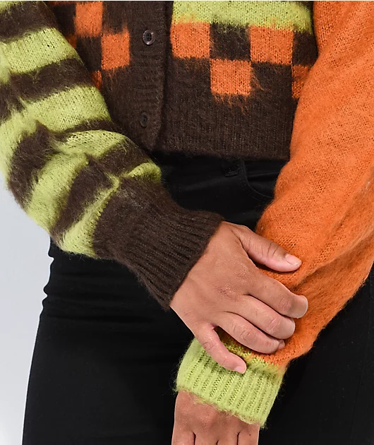 The Amber Dark Oak Obey cardigan sweater comes in a crop construction with green, brown, and orange colorblocking and stripes throughout for a whimsical, earthy look. This 100% acrylic cardigan has 3-button closure and a low v-neck collar that is perfect