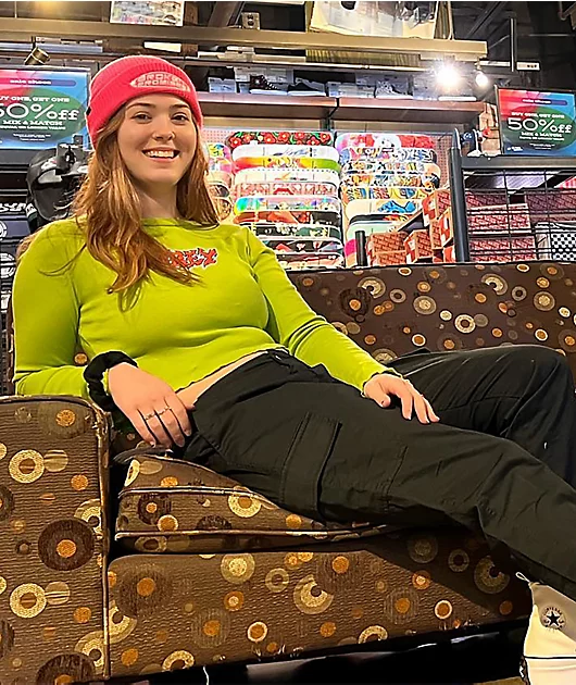 The Jess Flame Logo Obey t-shirt is made of 100% cotton and comes in a long sleeve, crop construction with lettuce cut hems on the sleeves and bottom hem. Adorning the front is a screen-printed graphic of the flame Obey logo in blue and red.