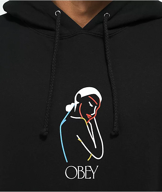 The Lady Obey hoodie is featured in a black colorway and finished off with a multicolored embroidery of a woman on the center of the chest. This hooded pullover has a hood with an adjustable drawstring, kangaroo pouch pocket, and is made from a warm blend