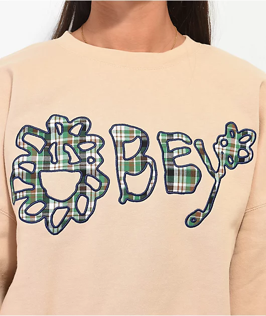 The Obey Nana crewneck sweatshirt comes in an oat milk colorway, with a stylish cropped silhouette with a relaxed fit. Embroidered branding can be seen on the chest, with green and brown plaid detailing. With ribbed accents along the cuffs, collar and bot