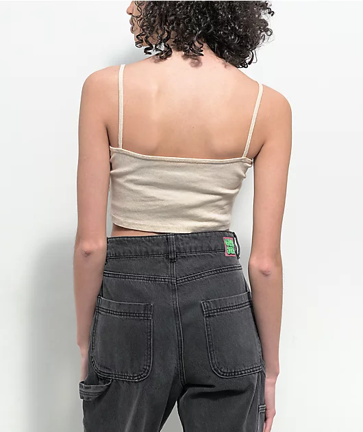 The Obey Scatch N Sniff crop tank top comes in a cream white colorway, and features a screen printed graphic of a hand drawn cherry. The slim, cropped style of the shirt is accented by skinny spaghetti style straps, and a printed tag for comfort.