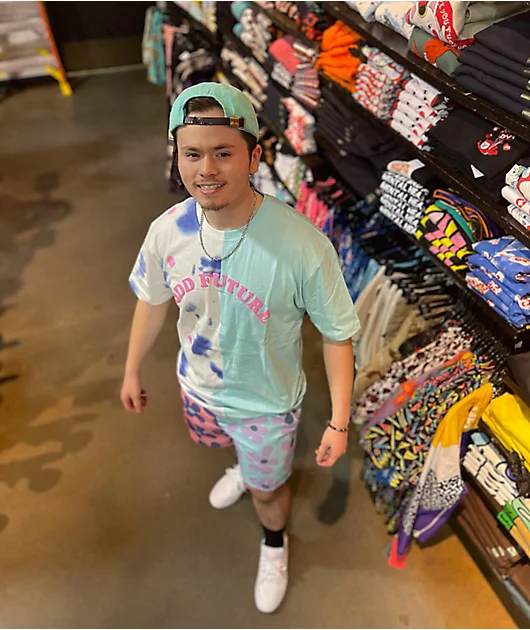 The Center Odd Future t-shirt has a vertically split design, with the left side in teal and the right in white and blue tie dye, and is finished with thickly screen-printed brand text on the chest. With its crewneck collar, short sleeve silhouette, and pr