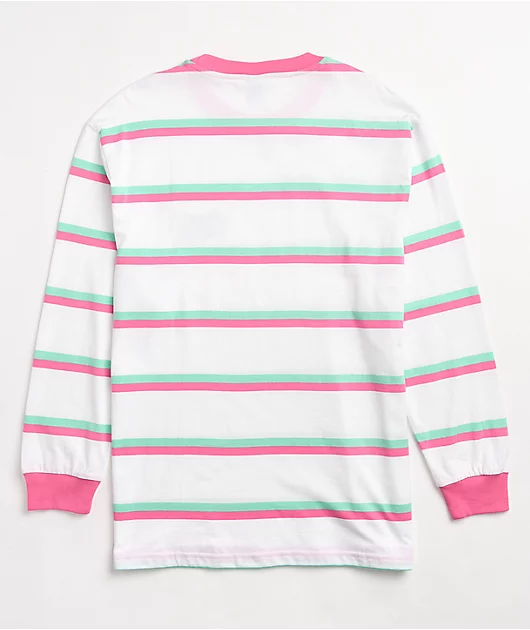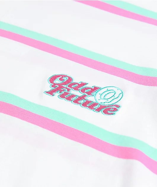 Add a pop of pastel color to your closet with the Pink and blue stripe long sleeve t-shirt from Odd Future! The light pink and blue stripes against a white background lend the shirt a dash of colorful flair, while the all-cotton construction and long-slee