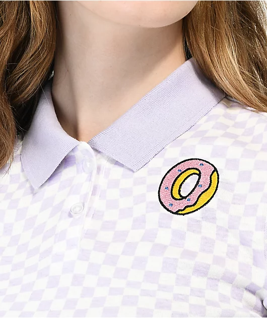 Odd Future’s purple checkered crop polo shirt features a tradition polo shirt silhouette with a purple fold-down collar, and a double-button collar closure, but with a cropped fit. Decorating the shirt is a light-purple and white checkered pattern through