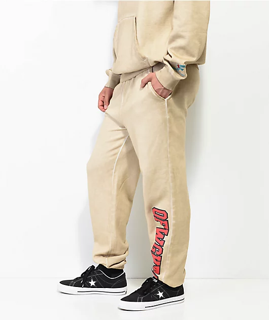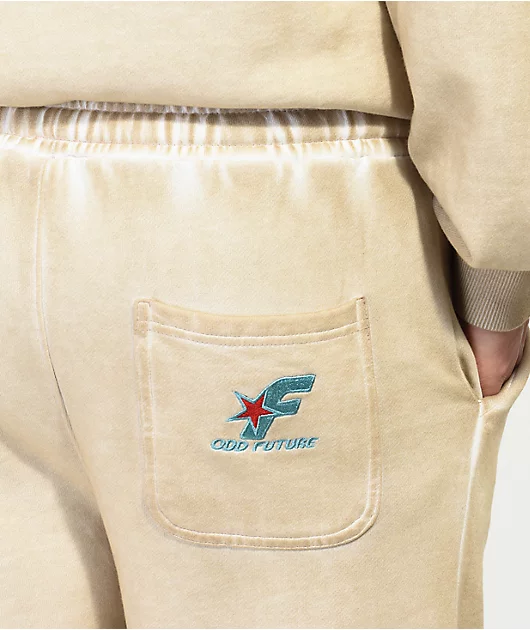 From Odd Future comes the University sweatpants, in an easy to pair natural beige colorway. Red collegiate script reading \”OFWGKTA\” is thickly screen-printed along the left ankle, while blue embroidery can be seen along the right seat pocket; adding an ex