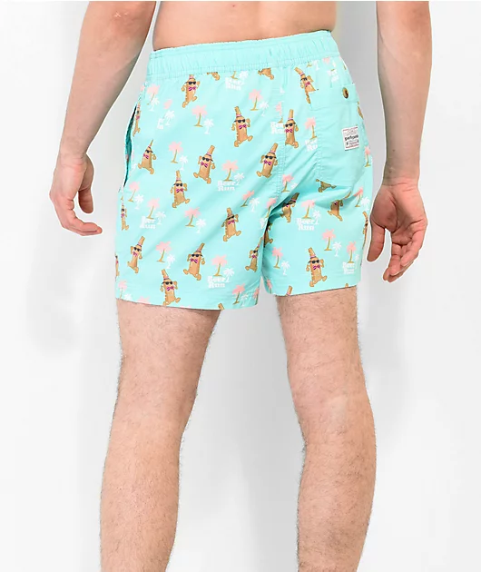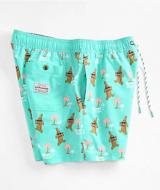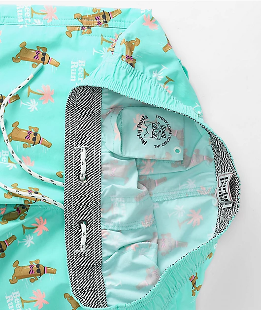The Beer Run board shorts from Party Pants comes in a mint blue colorway and has a retro short fit. The shorts are constructed from a blend of cotton, polyester and spandex, providing a breathable and