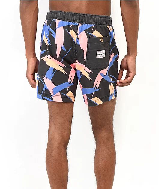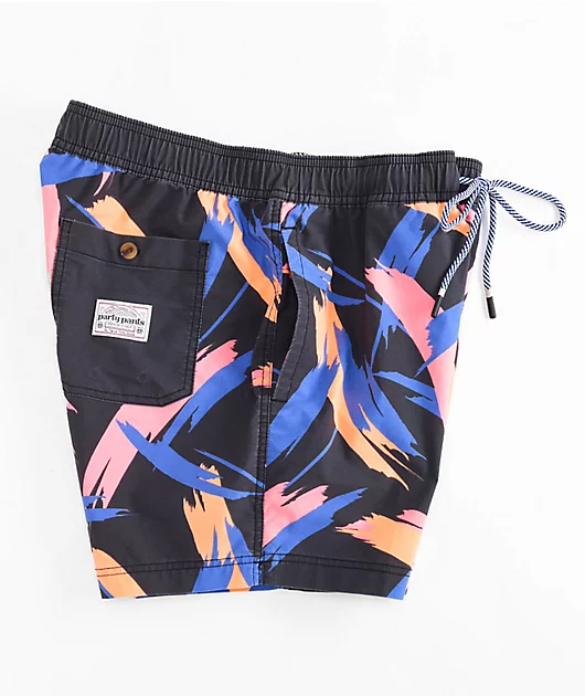From Party Pants, the Stroker board shorts come in a black colorway with a pink, blue and orange brush strokes pattern throughout. Made from a breathable cotton-poly blend, the above knee silhouette has a liner-less design with an elastic drawstring waist