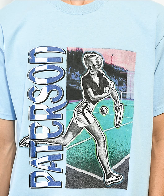 The Cross The Line Paterson t-shirt has a short sleeve silhouette and crewneck collar featured on light blue, midweight cotton. A female tennis player graphic is screen-printed on the chest for a nostalgic look.
