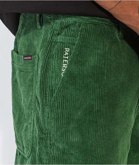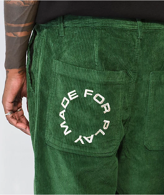 These Paterson skate pants come in a wide leg corduroy construction with a dark green colorway and embroidered script reading, \”Made for play\” on the back left pocket. These 100% cotton pants feature