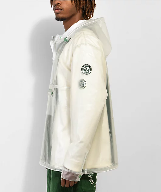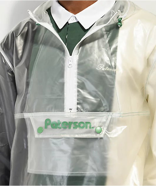 The transparent Paterson anorak jacket features a 100% thermoplastic polyurethane construction with a half zip, a drawstring-adjustable hood, and a kangaroo pouch pocket on the front. This jacket is adorned with screen-printed brand script in green on the