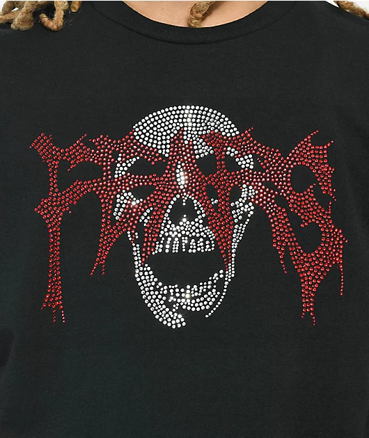 Face your fears with this Rhinestone Skull t-shirt from personal fears, coming in a black colorway. Featured on the front chest is a graphic of a skull done in silver rhinestones, complete with ruby red stones spelling out the word \”fears\” in a gothic fon