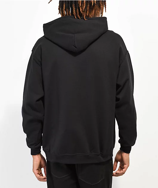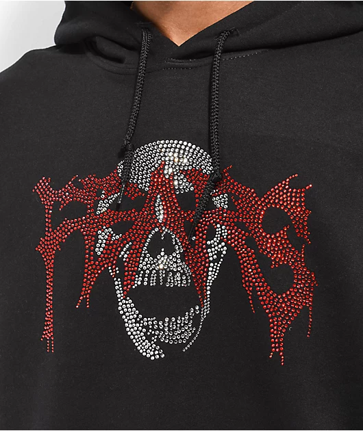 The Skull Rhinestone hoodie from Personal Fears comes in a solid black colorway and has a drawstring adjustable hood and a kangaroo pouch pocket. The front of the sweatshirt features a graphic of a skull as well as logo script made from small rhinestones