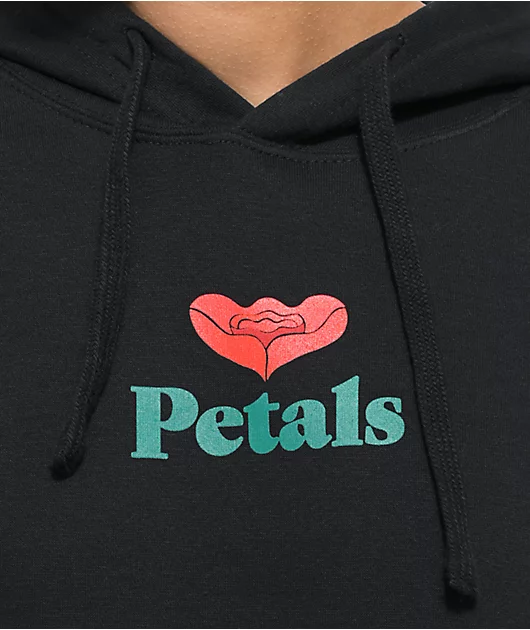Petals and Peacocks presents the Go Around black crop hoodie with a red flower and \”Petals\” printed at the chest in green lettering. The back features a large graphic of a tan hand holding a red flower with Petals logo text. Offering a cropped fit and a