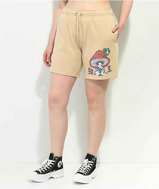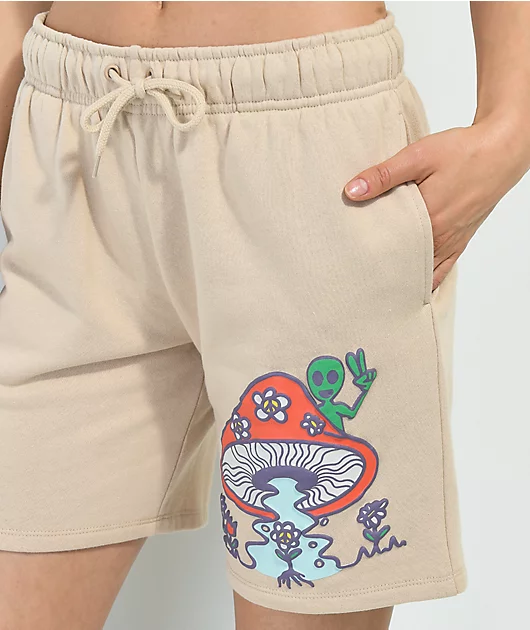 The Choose Peace sweat shorts from Petals By Petals And Peacocks come in a natural colorway with a screen-printed graphic of an alien peaking out behind a mushroom on the left leg and an embroidered brand logo on the right leg. These shorts are made of a