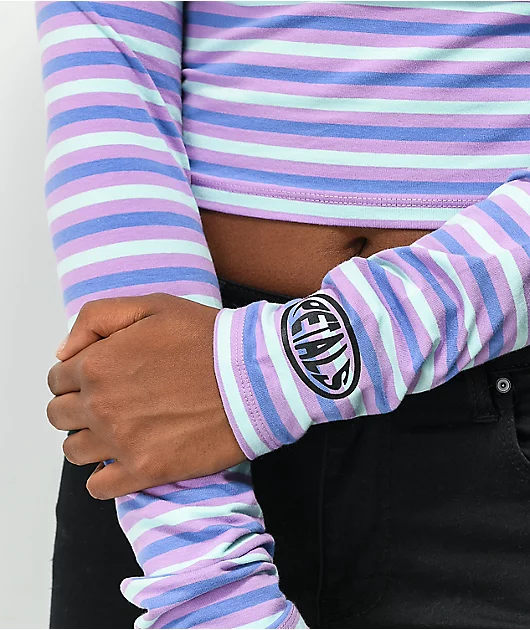 Fling some fluttery flair into your ‘fits with the I Fly You Fly mock neck crop top from Petals by Petals and Peacocks! Pastel-toned stripes in shades of green, blue, and purple descend down the top, lending it a splash of striking color, while the shirt’