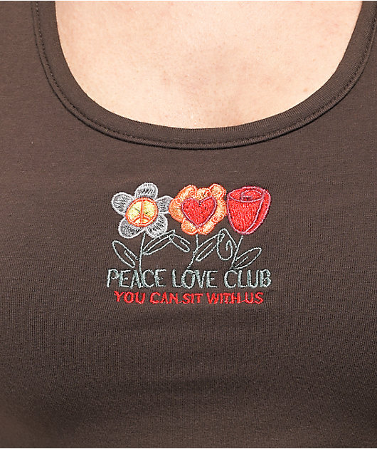 This ultra-cropped halter top from Petals by Petals and Peacocks is made from a stretchy, breathable blend of cotton and spandex, and comes in a brown colorway. Embroidered on the chest are flowers and text below reading, \”Peace love club | You can sit wi