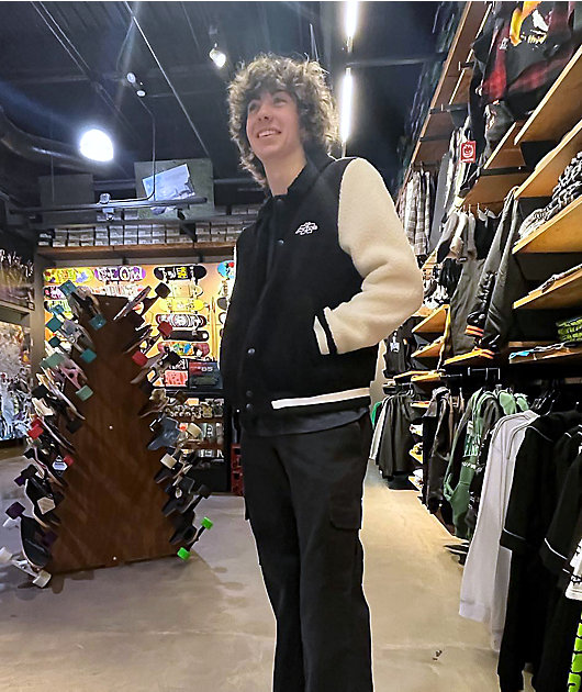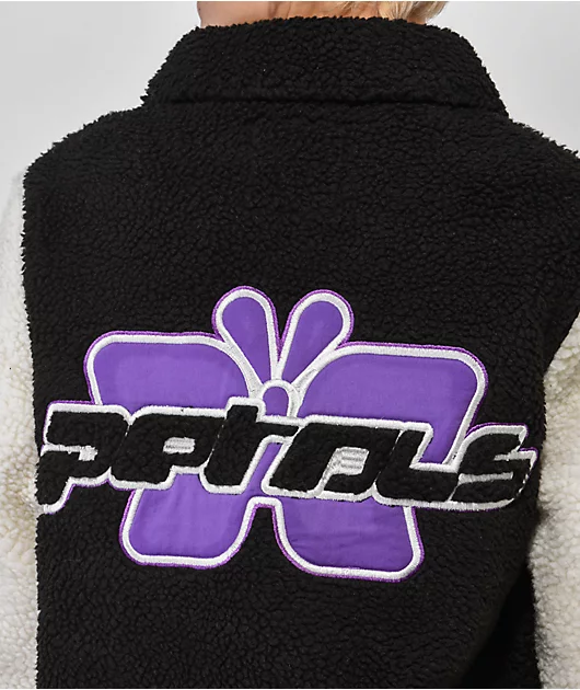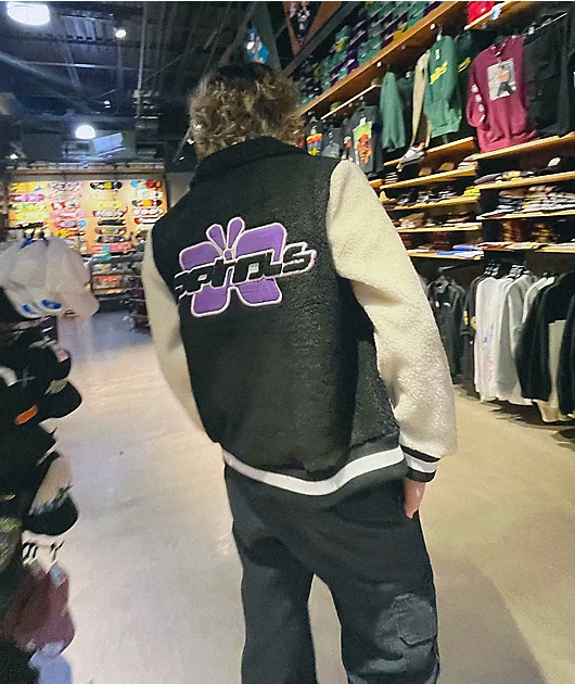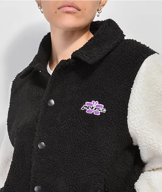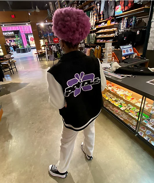 This Petals by Petals & Peacocks varsity jacket comes in a black and white colorway with an embroidered flower graphic in purple on the left of chest and back. With a soft sherpa construction, this jacket is the perfect choice for any weather. This mo