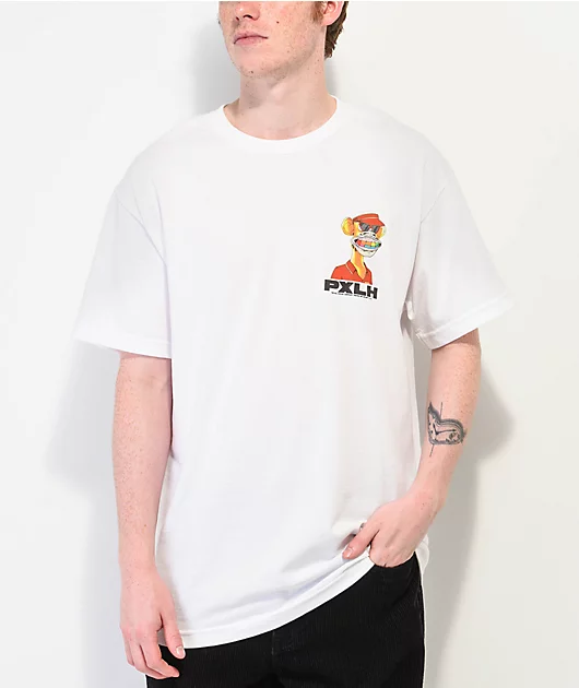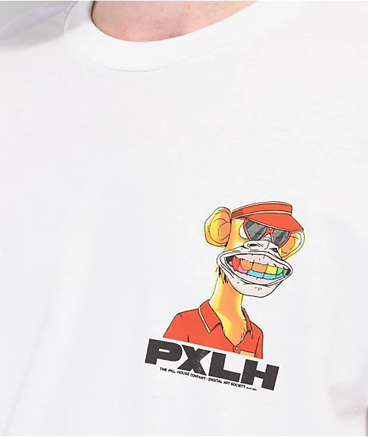The Golden Supersize t-shirt from Pixel House comes in a white colorway with a graphic of a golden Bored Ape screen-printed on the left chest and back. Made from breathable midweight cotton, the Pixel House t-shirt is finished with a printed neck label an