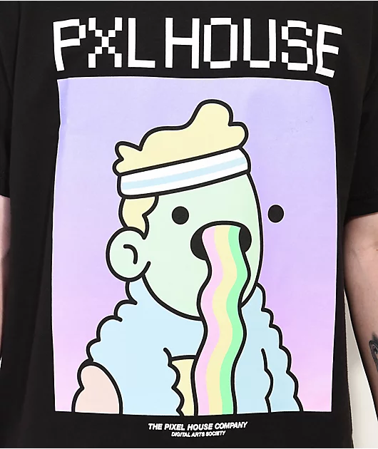 The Rainbro Barf t-shirt from Pixel House comes in a black colorway, featuring a Doodles graphic designed by Burnt Toast. The NFT-inspired t-shirt depicts a cute figure throwing up rainbows on the front, as the 100% cotton t-shirt is finished with a tagle