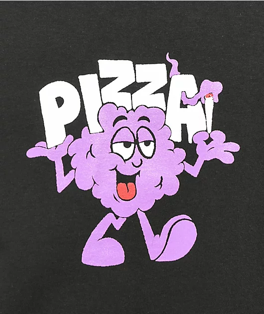 The Smoke Pizza t-shirt is made of a soft, lightweight cotton and features a black colorway with a screen-printed graphic on the front of a personified purple smoke puff holding a joint with the brand name behind its head.