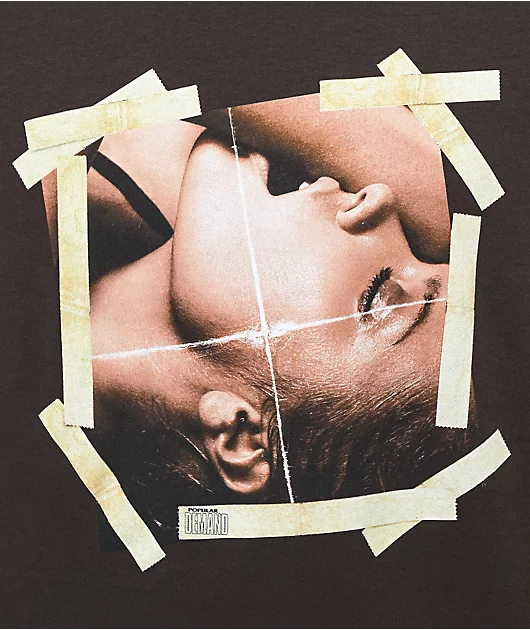 The Masking short-sleeved t-shirt from Popular Demand is made from midweight, breathable cotton and comes in a deep brown colorway with a screen-printed graphic of a close-cropped, open-mouthed, suggestive woman on the chest.