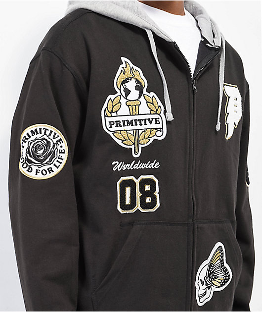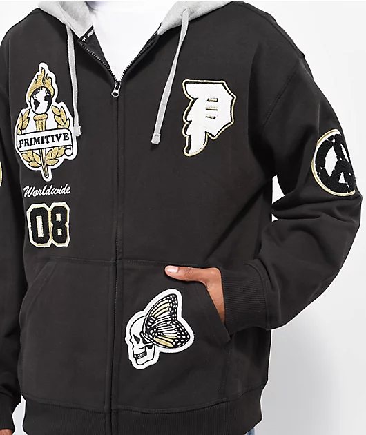 The Alumni zip hoodie from Primitive comes in a black colorway, with beige chenille patches throughout for a varsity-inspired look. A large embroidered tiger is sewn onto the back, as a grey drawstring hood, a brushed interior, a full zip closure, and rib